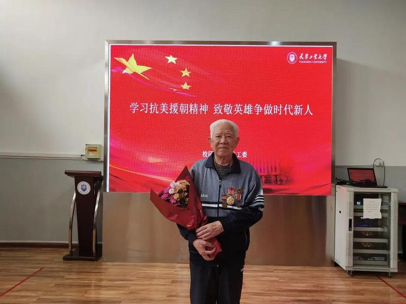 刘馨远老师今年89岁高龄,是一位拥有70年党龄的老党员。他深情回忆了自己的成长经历。小时候他是穷苦人家出身,14岁当纺织学徒,积极参加生产,积极参加政治活动。19岁加入中国共产党,报名支援东北生产,参加抗美援朝战争,战争胜利后退役来到工大。刘老师从个人经历谈起,深情回忆了参加抗美援朝的这段经历。 他分享自己作为一名紧急的战地救护员,在战场面对行军轰炸,千锤百炼、九死一生,与他一同参军的5名战友有3人没能生还。他不顾自己生命,紧急抢救伤员。他说:“第一次参加战争说不怕死是假的,当时谁都怕,尤其是当美军的轰炸机在头顶飞过的时候。但是身为一名党员,在祖国最需要的时候他必须首当其冲,保家卫国是我们坚定的信念!”在讲述过程中同学们注意到当时的参加战争刘老师正好刚结婚不久。这种舍小家为大家的精神更加的让同学们为之动容。