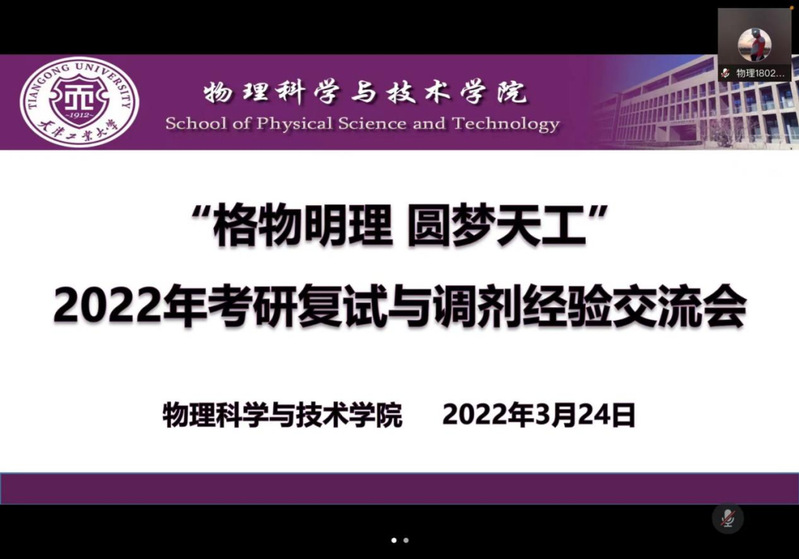 群策群力,同向同行。为切实做好毕业生就业指导与服务工作,3月24日成人a片 举办了主题为“格物明理 圆梦天工”的考研复试与调剂线上经验交流会。学院党委副书记贾彦军,副院长廖帮全,科研办主任陈琮老师、教师代表、全体辅导员以及2018级考研学子参加了本次会议。会议由党委副书记贾彦军主持。