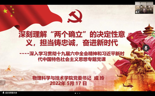 2022年5月17日晚,成人a片 党委书记成玲以“深刻理解‘两个确立’的决定性意义,担当铸忠诚,奋进新时代”为题讲授专题党课。本次专题党课是深入学习贯彻习近平新时代中国特色社会主义思想和党的十九届六中全会精神的一次主题宣讲,也是学院党委理论学习中心组扩大学习和干部专题培训。学院党委委员、学院领导班子成员、各基层党支部书记、各系室(中心)主任以及各办公室行政管理人员聆听了本次党课。