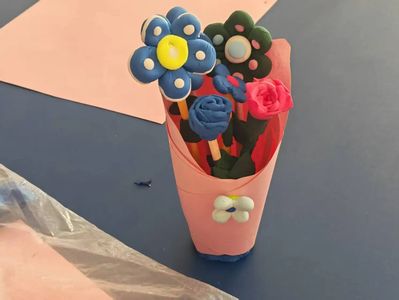 活动现场,一场别开生面的手工课堂拉开帷幕。志愿者们耐心地教孩子们用粘土和扭扭棒制作花束。大家围坐在桌旁,目光紧紧追随志愿者老师的一举一动,小手灵活地将彩色粘土块、扭扭棒塑造成一片片娇艳的花瓣。不一会儿,桌上原本散落的材料,在孩子们的巧手下,摇身一变成为了一朵朵绚丽的花朵。随后,孩子们小心翼翼地把花朵插在泡沫板上,精心排列成一个个小巧精致的花圈、花束,每一朵花都饱含着孩子们对先烈的深深敬意。